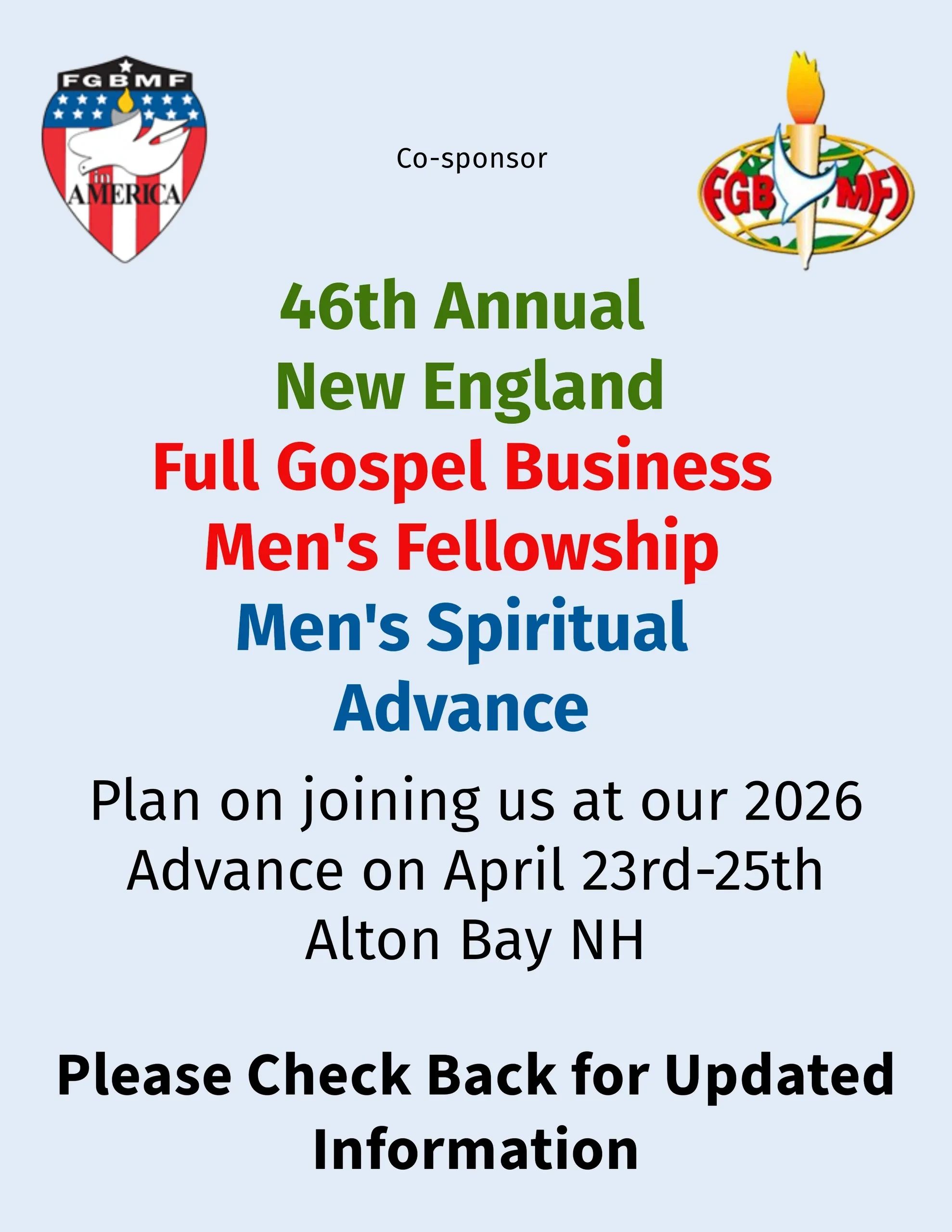 The New England Men's Advance is jointly sponsored by the New England Chapters of Full Gospel Business Men's Fellowship in America (FGBMFA) and Full Gospel Business Men's Fellowship International (FGBMFI).